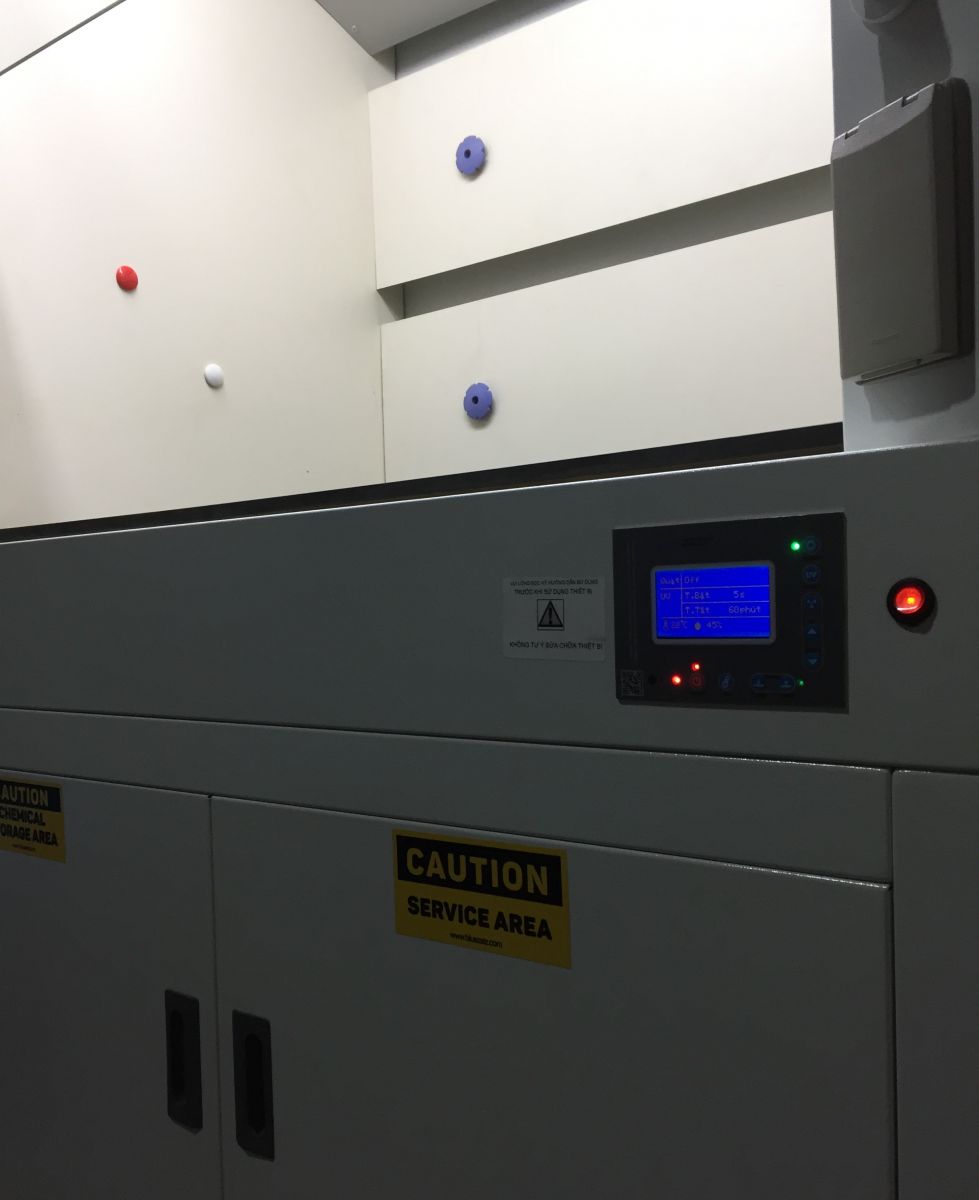 Bảng điều khiển điện tử: Điền khiển bằng bộ vi xử lý AMC-1, màn hình rộng (kích thước Rộng 71 mmx Cao 40 mm), màn hình màu xanh xương, có đèn nền, được thiết kế hiện đại và tiện lợi cho phép điều chỉnh các tham số: bật tắt nguồn; bật, tắt, tăng giảm tốc độ quạt; hẹn giờ bật, tắt đèn UV; hiển thị nhiệt độ, độ ẩm cục bộ bên trong tủ hút; đặt giờ hệ thống theo thời gian thực; hẹn giờ tắt hệ thống; bàn phím nổi, có ấm thanh khi ấn nút.