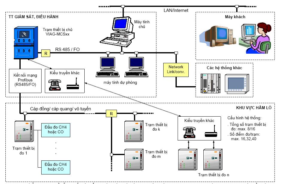 Sơ đồ tổng thể Hệ thống giám sát khí mêtan tự động tập trung phục vụ an toàn trong khai thác hầm lò
