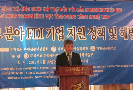Ngày 15/05/2013, tại Hà Nội, Cục Ứng dụng và Phát triển công nghệ phối hợp với Vụ Công nghệ cao, Văn phòng chứng nhận hoạt động công nghệ cao và doanh nghiệp KH&CN và Hiệp hội doanh nghiệp Hàn Quốc tại Việt Nam (KORCHARM) tổ chức Hội thảo quốc tế “Các chính sách và giải pháp hỗ trợ doanh nghiệp FDI trong lĩnh vực công nghệ cao”. Tham dự Hội thảo có đông đảo doanh nghiệp Hàn Quốc tại Việt Nam và các nhà quản lý, nghiên cứu hiện đang hoạt động trong lĩnh vực công nghệ cao.