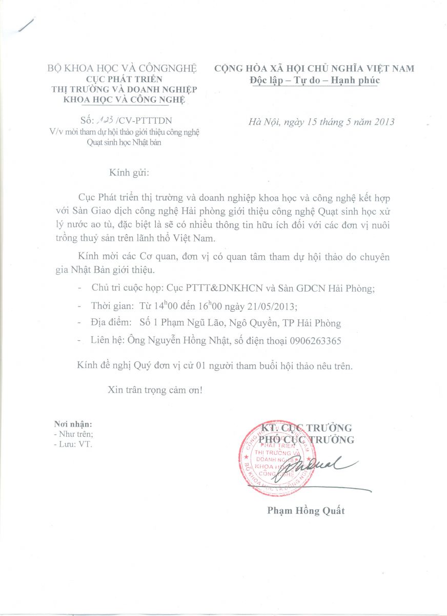 Nhằm giới thiệu và cung cấp các thông tin hữu ích về công nghệ xử lý nước ao tù bằng quạt sinh học (Công nghệ Nhật Bản) tới các đơn vị nuôi trồng thủy, hải sản, Cục phát triển thị trường và doanh nghiệp khoa học và Công nghệ kết hợp với Sàn giao dịch Công nghệ và thiết bị Hải Phòng tổ chức