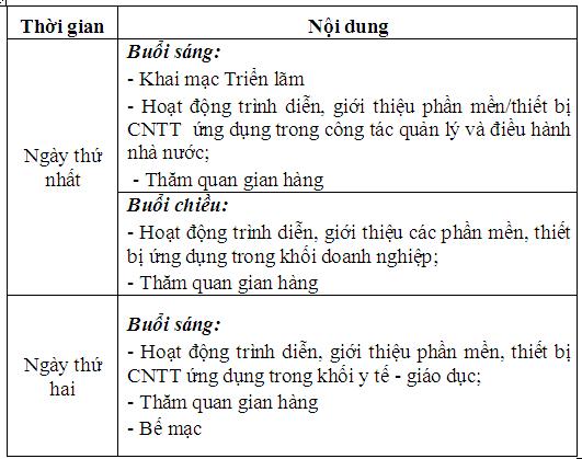 - Đơn vị tham gia tổ chức:Các tổ chức, doanh nghiệp trong và ngoài nước hoạt động trong lĩnh vực CNTT có nhu cầu giới thiệu, trình diễn, chào bán các phần mềm ứng dụng trong công tác quản lý, điều hành khối cơ quan nhà nước; các phần mền ứng dụng trong lĩnh vực y tế - giáo dục, doanh nghiệp, khách sạn.