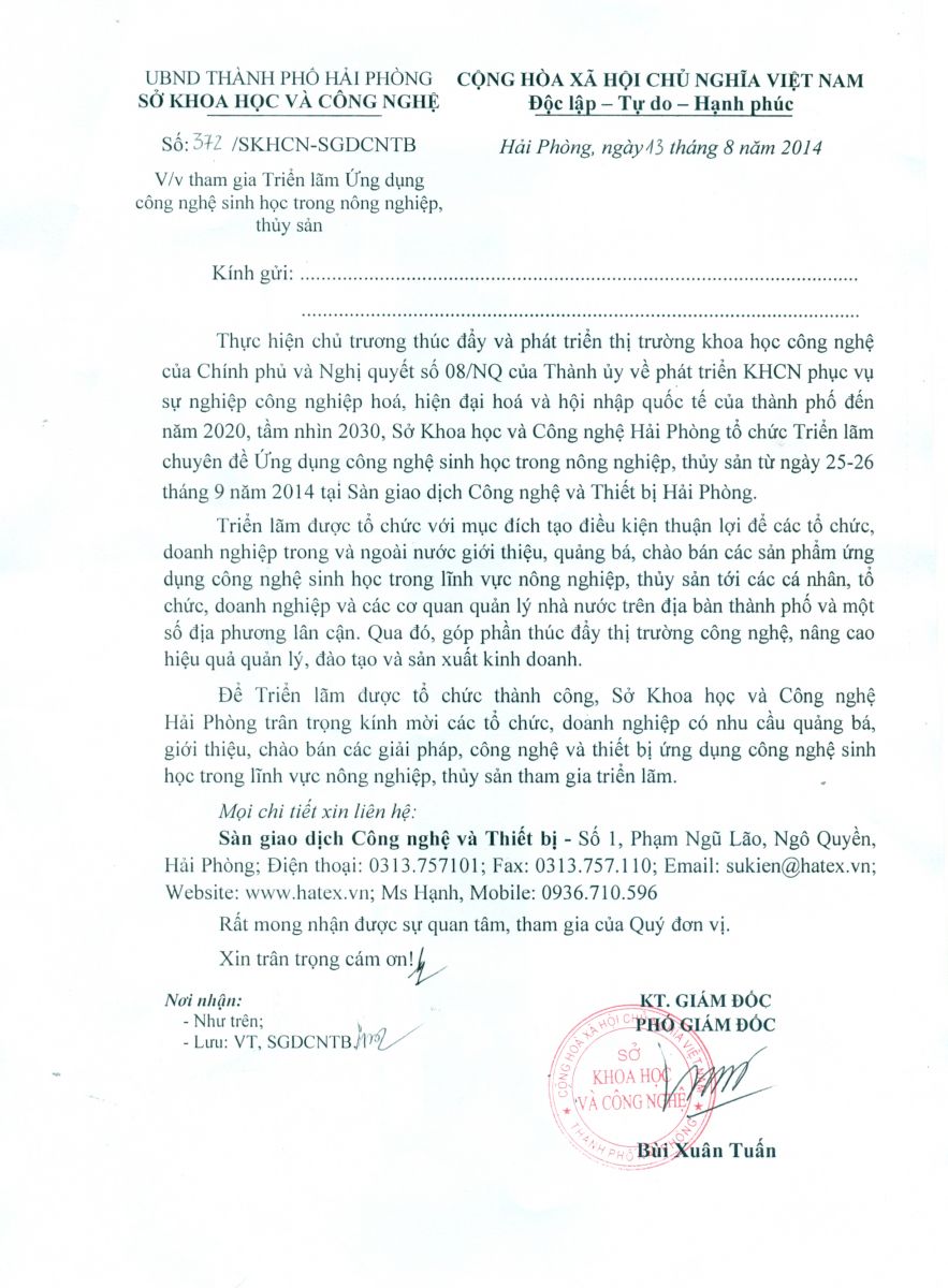 Thực hiện chủ trương thúc đẩy và phát triển thị trường khoa học công nghệ của Chính phủ và Nghị quyết số 08/NQ-TU của Thành ủy về phát triển KHCN phục vụ sự nghiệp công nghiệp hoá, hiện đại hoá và hội nhập quốc tế của thành phố đến năm 2020, tầm nhìn 2030, Sở Khoa học và Công nghệ Hải Phòng tổ chức Triển lãm chuyên đề Ứng dụng công nghệ sinh học trong nông nghiệp, thủy sản từ ngày 29-30 tháng 9 năm 2014 tại Sàn giao dịch Công nghệ và Thiết bị Hải Phòng.